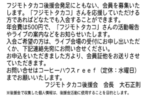 チケット販売数は目標を超えましたが、この地域のこの時期はイベントや農作業などで地域的にも忙しいこともあって超満員とはなりませんでした。 しかしながら3曲もアンコールをしていただきまして会場が一体となることができたと思います。 地元に後援会ができて、微力ながら応援やサポートができる体制になってきましたので、フジモトタカコさんも一層の飛躍を期待したいところです。