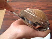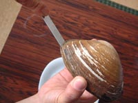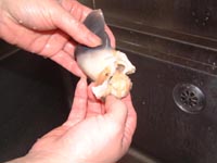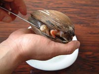 ![]() 6.貝むきへらを貝の内側に沿って移動させ、貝から身をはずす。 |