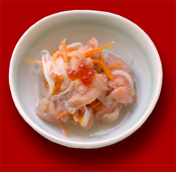 塩物を使う場合は、良く塩抜きをして、ダイコンとニンジンの千切とともに甘酢に漬け込みます。