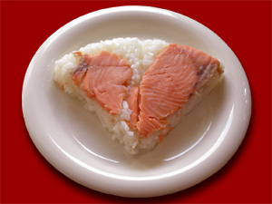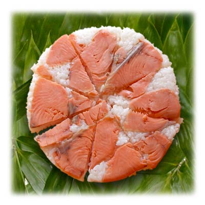 円柱形(四角形でもかまいません)の容器に笹の葉(ラップでもかまいません)を敷き詰め、5mmほどの厚さにスライスした鮭を並べ、その上にすし飯を被せます。