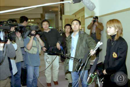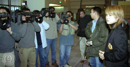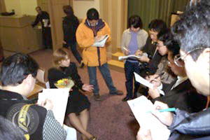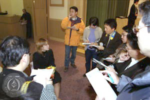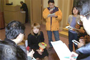 2001年12月30日、激励会の中で急遽開かれた共同記者会見(写真上)とインタビュー(写真下)。集まった報道機関は16社。標津町では最高の報道機関数が集まったことになります。いかに大菅選手が注目されているかが、あらためてわかりました。