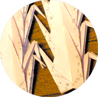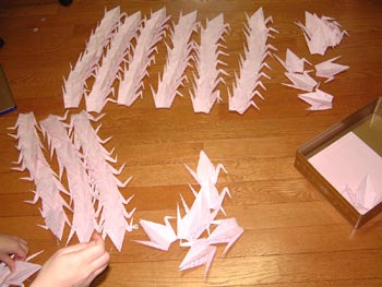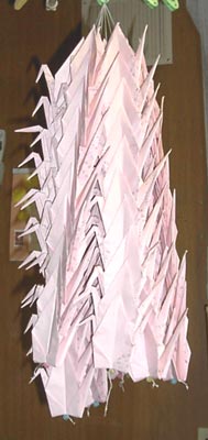 折り方すら忘れていた人もいて、思ったより時間がかかるもので、いわゆるアナログとデジタルの融合はそう簡単ではないと実感しました。 下の写真のように1羽の鶴に一人分のメッセージをプリントしてあります。 写真上は糸で10羽くらいずつまとめて、写真右のようになりました。