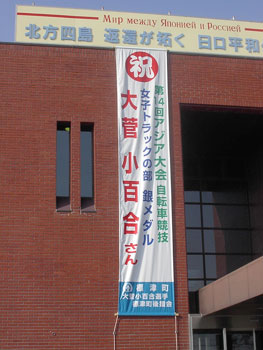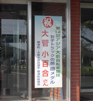 大菅選手の故郷・標津町の役場にアジア大会自転車競技での「銀メダル」を祝して垂れ幕とポスターが張り出されました。