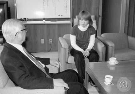 4月2日、大菅選手は役場を訪れ、小田桐町長に「応援ありがとうございました」と、あいさつ。小田桐町長は、「今シーズンの国内最高記録(38秒34=500m)を出して、ワールトカップで優勝したのは快挙。頑張りましたね」と、大菅選手をたたえました。