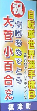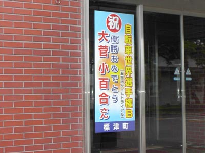 標津町出身のスピードスケーター大菅小百合選手が、自転車世界選手権において優勝されたことを祝して標津町内の公共施設に張り出されたミニ垂れ幕です。 ちょっとレポートが遅くなりましたが、標津町内の全ての公共施設に張り出されました。 標津町の人達が、夏と冬と両方のオリンピックで活躍される大菅選手を夢見ながら応援しています。