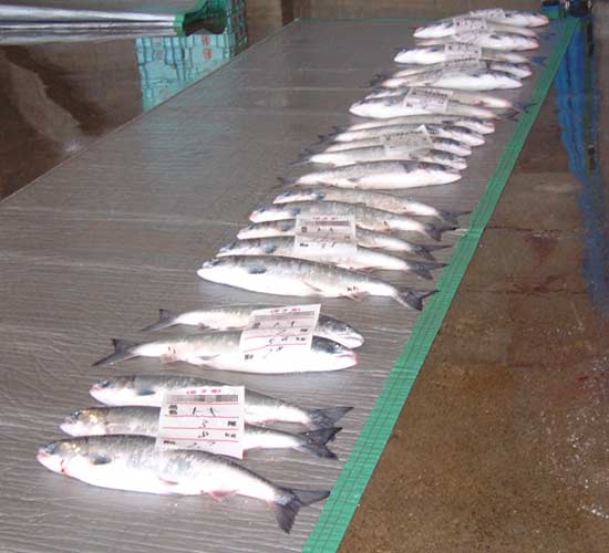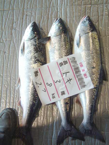 このように市場内に保温シートを敷いてトキシラズを並べセリにかかります。 大きさや各番屋により1尾から3尾程度に分けられて、番屋の名前・トキシラズであること・尾数・重さなどを書き込んだ指定用紙を張り付けられます。